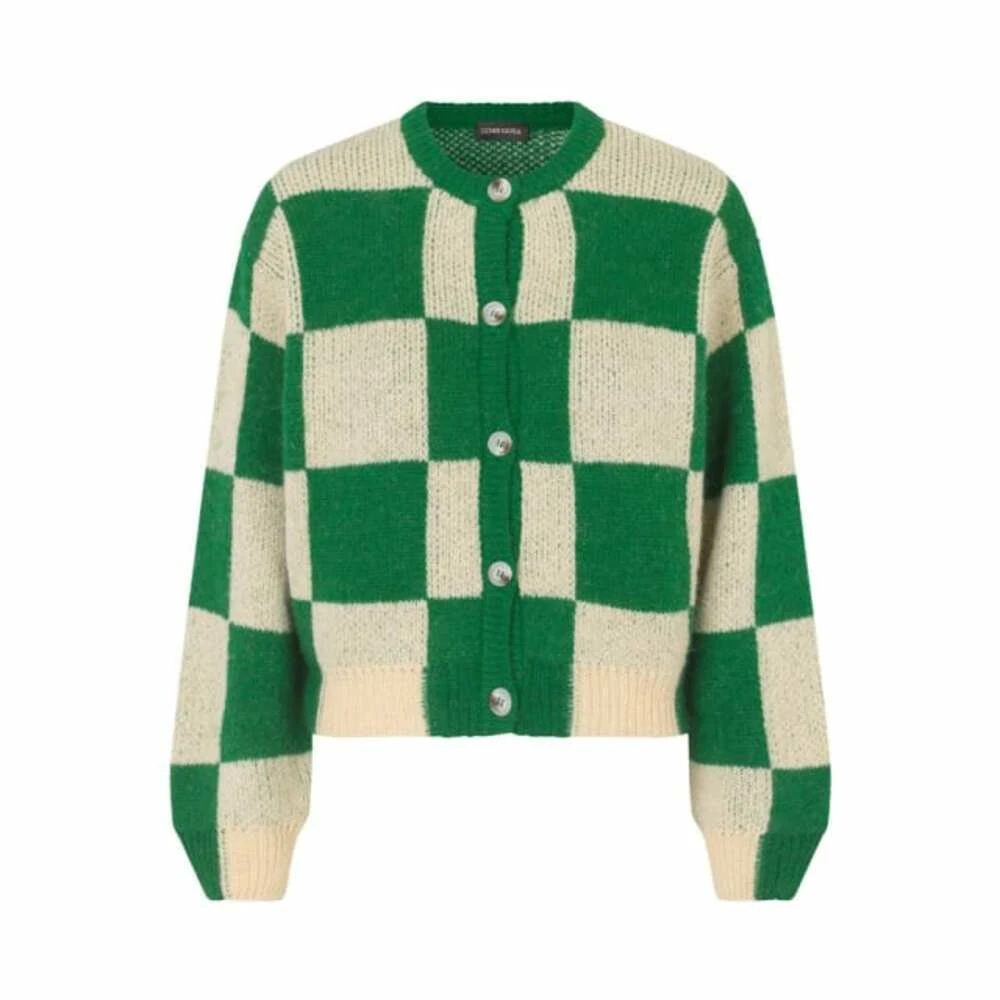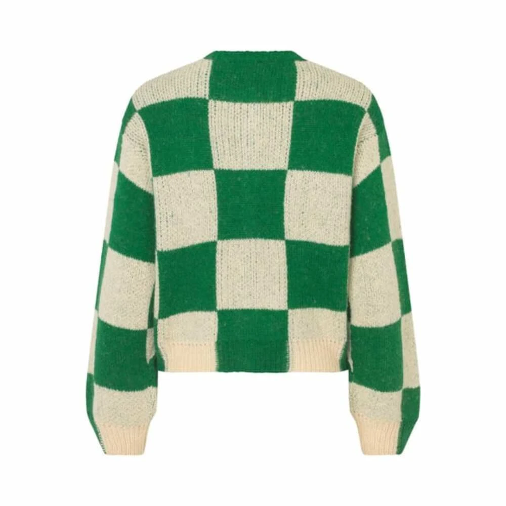 Ash cardigan i grønn krem melange. Strikket genser med en knapp med enkelt rutete mønster, ribnete bretter og store lange ermer med ermet ender. 45% akryl, 35% polyamid, 20% alpakka farge grønn krem melange