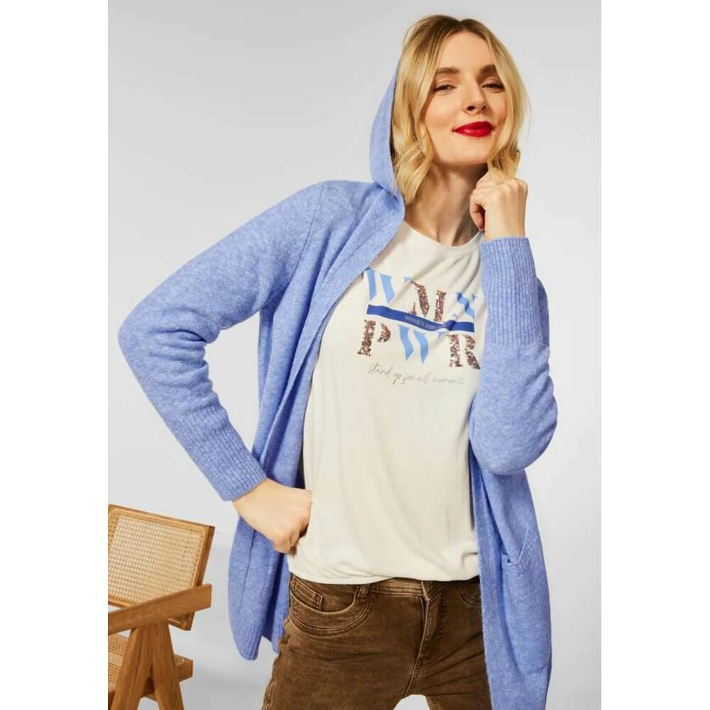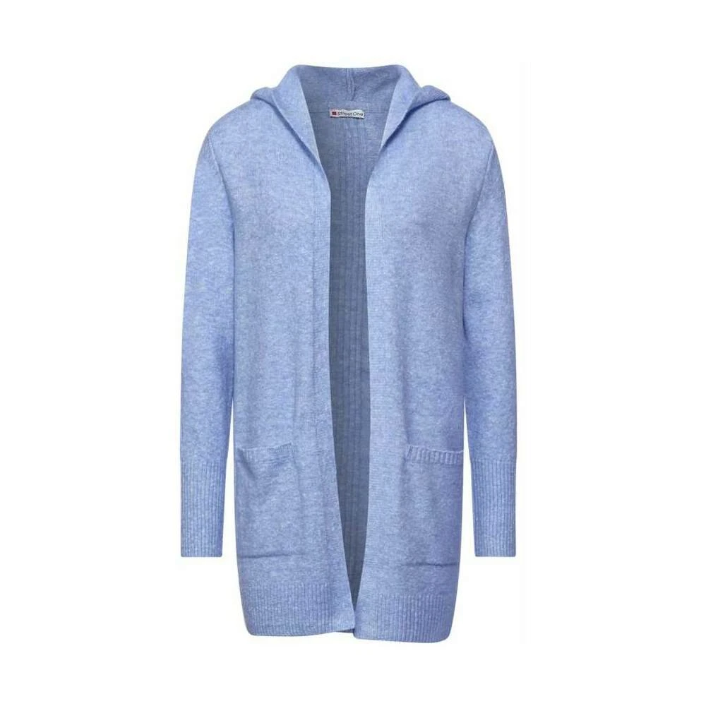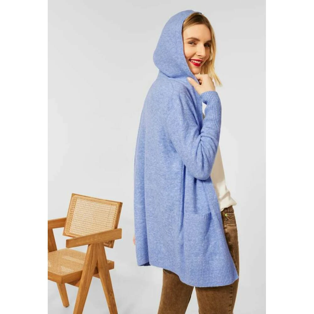 Rosa strikke jakke med hette, god lengde. åpen foran.