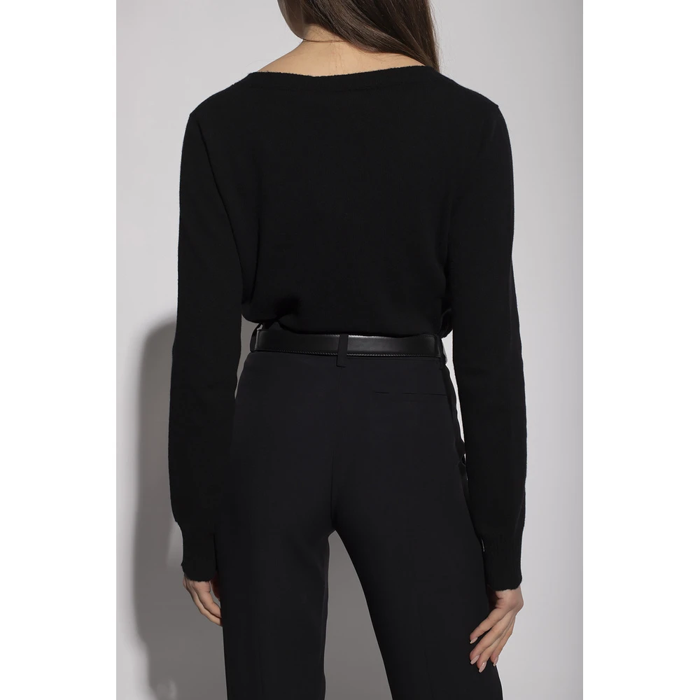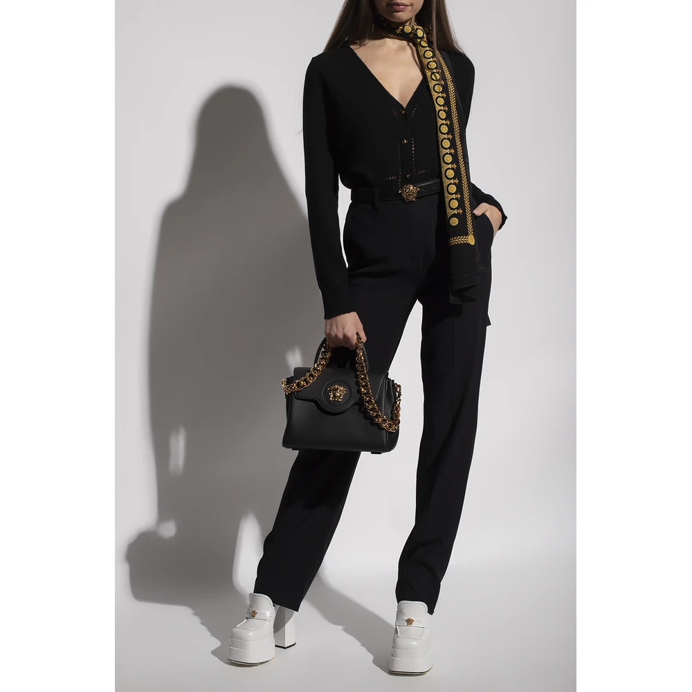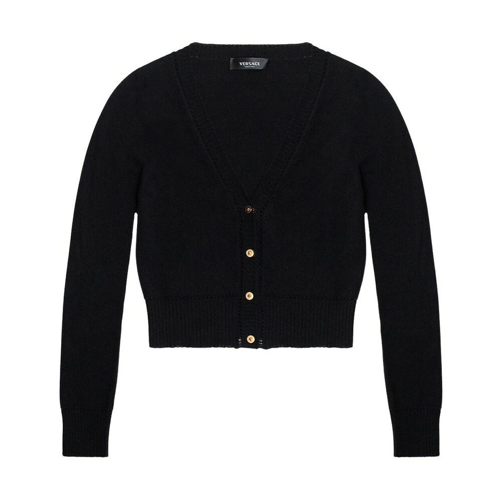Svart cardigan fra Versace. Denne stilen er laget av myke kashmir, og har særegne gulltoneknapper og strikkede trimmer på kantene.