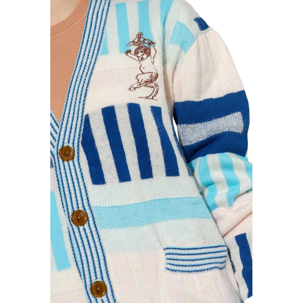 Flerfarget cardigan fra Vivienne Westwood. Denne V-hals-designen er festet med knapper, og har et geometrisk mønster, to lommer foran, logo-broderi og ribbestrikkede trimmer ved hem og mansjetter.